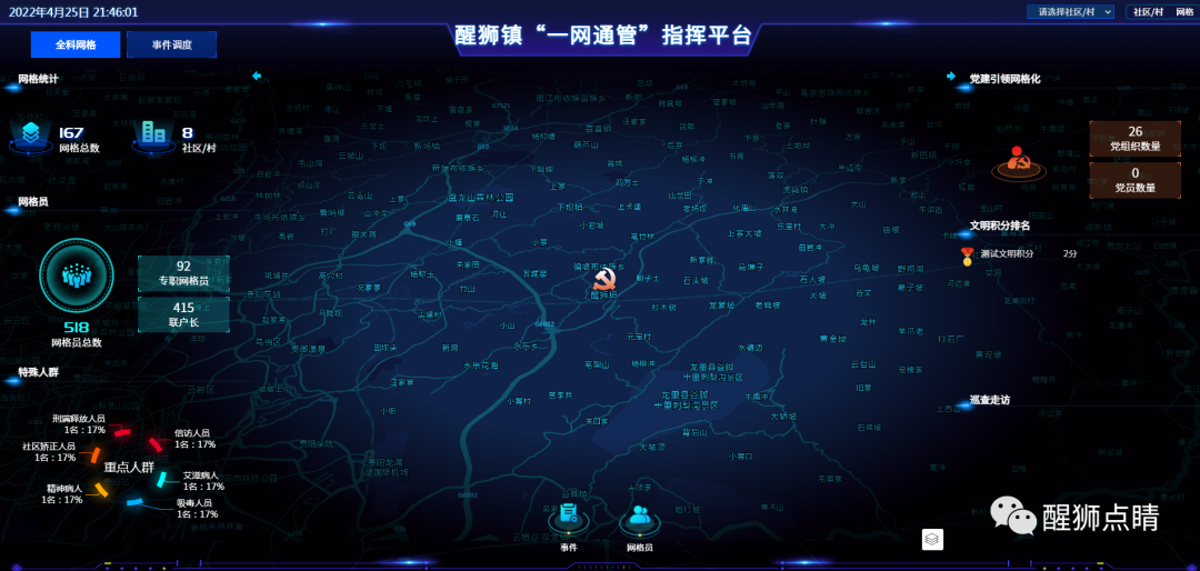 网格管理服务指挥中心搭建服务平台,应管尽管,提升基层治理水平。一是在推进网格治理信息化上下功夫。搭建醒狮镇“一网通管”智慧指挥平台,管理8个村(社区)“一键上报”事件数据,协同联动微信公众号“一键上报”和电话直报热线,打造多维治理、联动处置的智能化社会治理平台。截至目前,共录入反映数据239条、咨询367条、建议125条、投诉8条,处理各类事件721条,办结率97.56%,满意率98%。二是在推进网格治理一体化上下功夫。网格智能管理服务平台将镇级职能部门、网格队伍、“两代表一委员”及志愿者群体等进行综合管理,实现治理体系一体化,为基层治理精准研判、科学决策打下坚实基础。三是在推进网格治理高效化上下功夫。村(社区)网格管理服务站通过“智慧醒狮”APP及时将群众上报事件进行分类处理,涉及村(社区)层面的事件,分派至所在区域网格员解决,涉及镇级层面事件,反馈至醒狮镇“一网通管”智慧指挥平台,由镇网格管理服务指挥中心通过平台派发至分管领导解决。