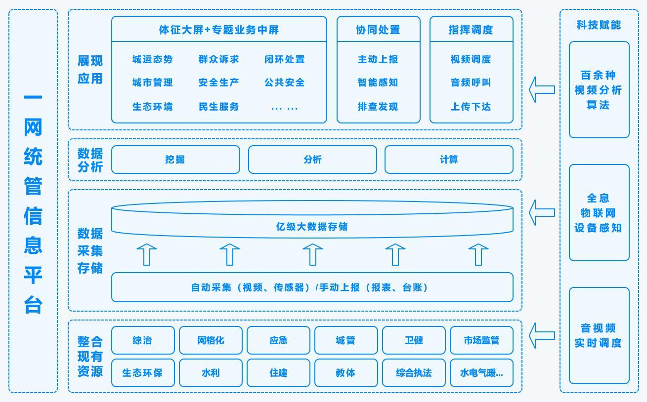 基于现有城市管理信息化系统,以网格化管理为基础,纵向对接省级平台和国家平台,联通区(市、县)平台,覆盖市、区、街道(镇)三级;横向整合对接共享市级相关部门信息系统,汇聚全市城市运行管理服务数据资源,构建“横向到边、纵向到底”的城市运行管理服务工作体系,对全市城市运行管理服务工作进行统筹协调、指挥调度、监测预警、监督考核、分析研判和综合评价,实现“一屏观全域,一网管全城”。
